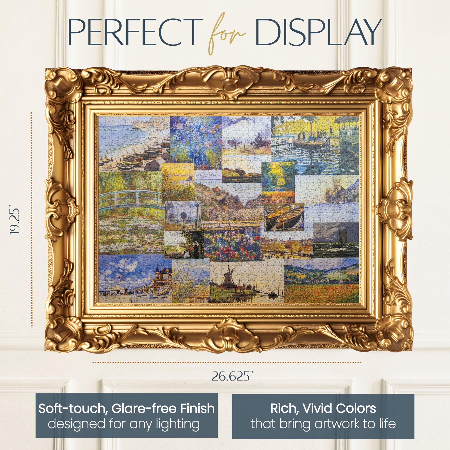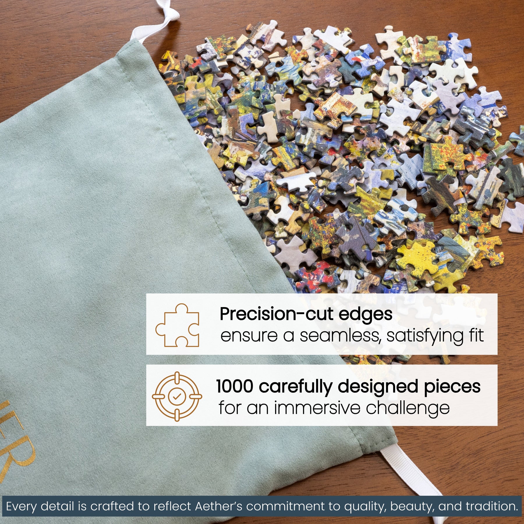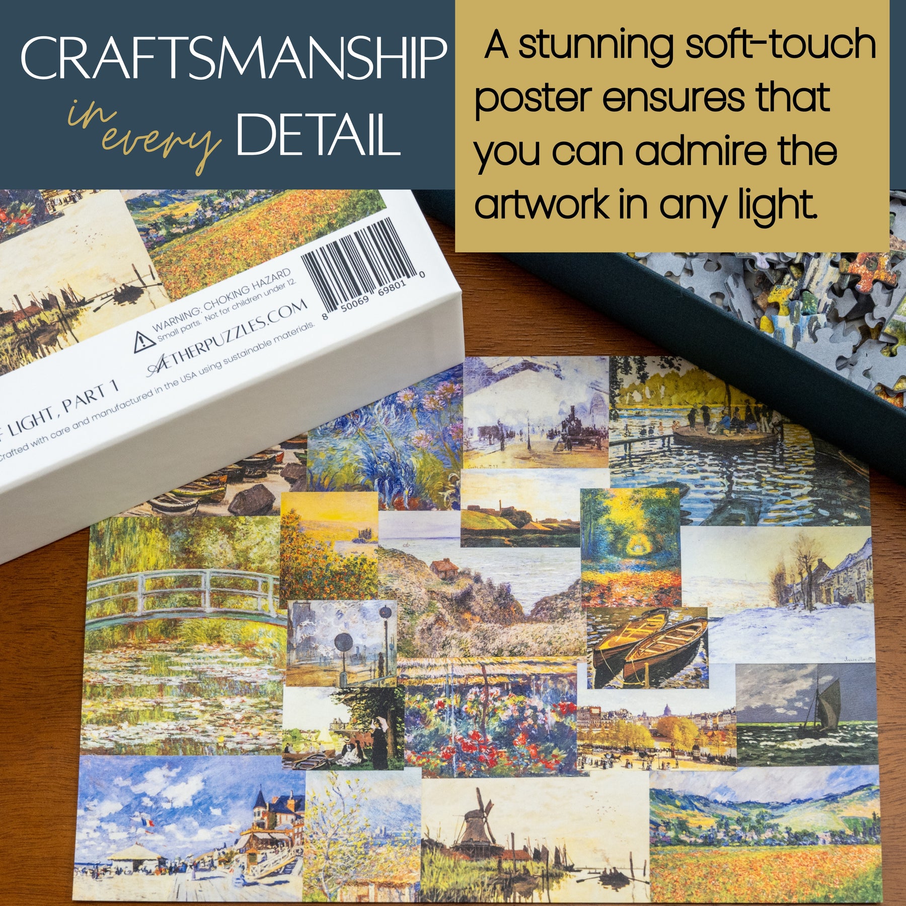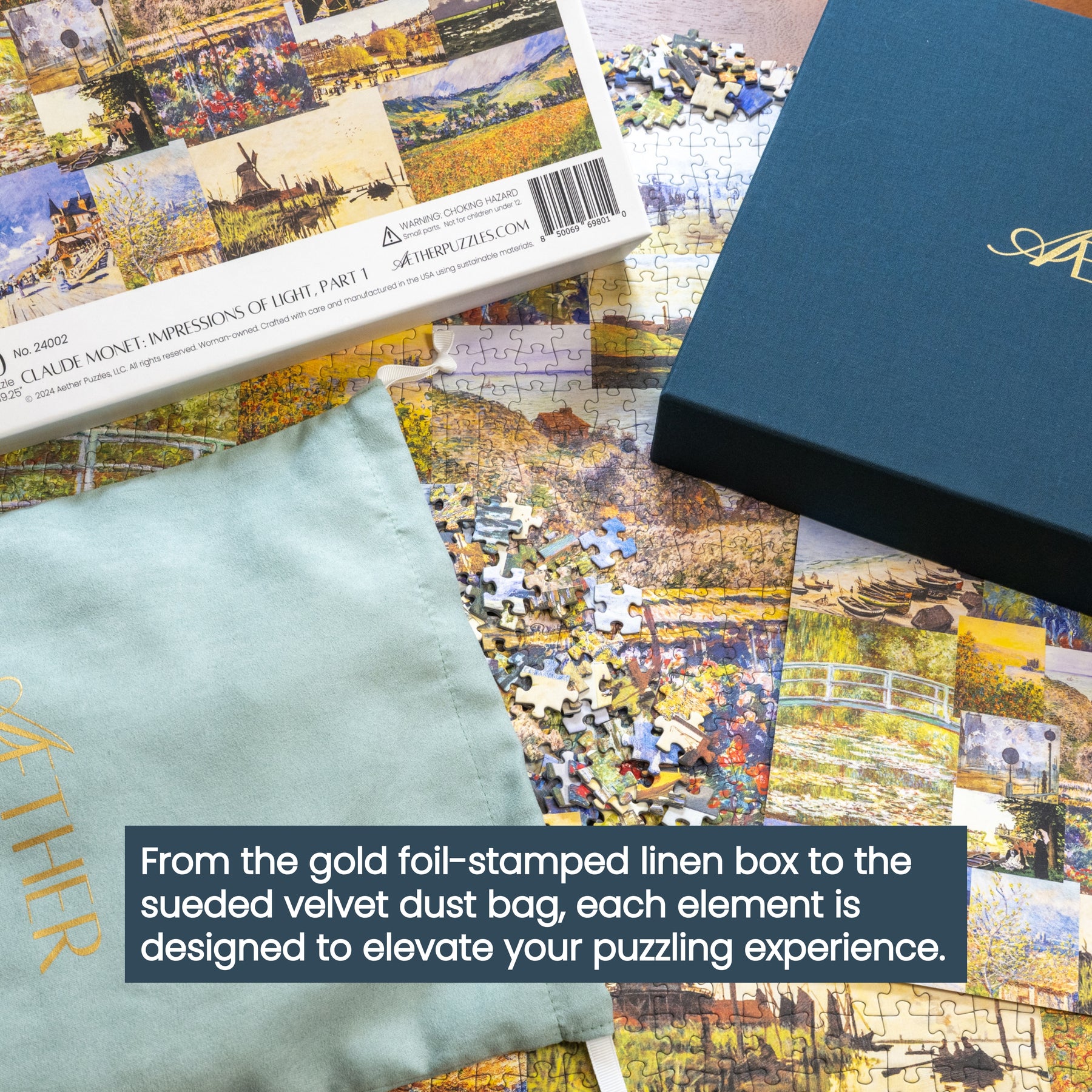 Explore the luminous beauty of Aether’s collection, Impressions of Light, part of an exclusive three-puzzle series celebrating the masterpieces of Claude Monet. This puzzle combines Monet’s iconic scenes—from tranquil water lilies and vibrant gardens to serene seascapes and picturesque landscapes. Crafted with exquisite attention to detail, each puzzle piece captures the ethereal light and delicate brushstrokes that define Monet’s Impressionist genius. A perfect addition to your collection, this puzzle offers a sophisticated and immersive experience, evoking the timeless elegance of one of the world’s most celebrated painters.
