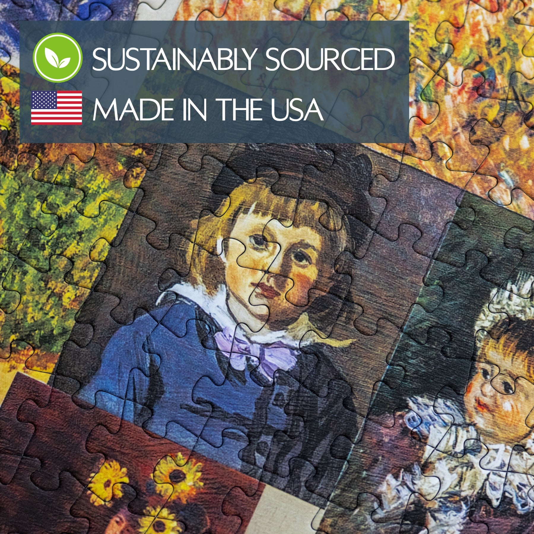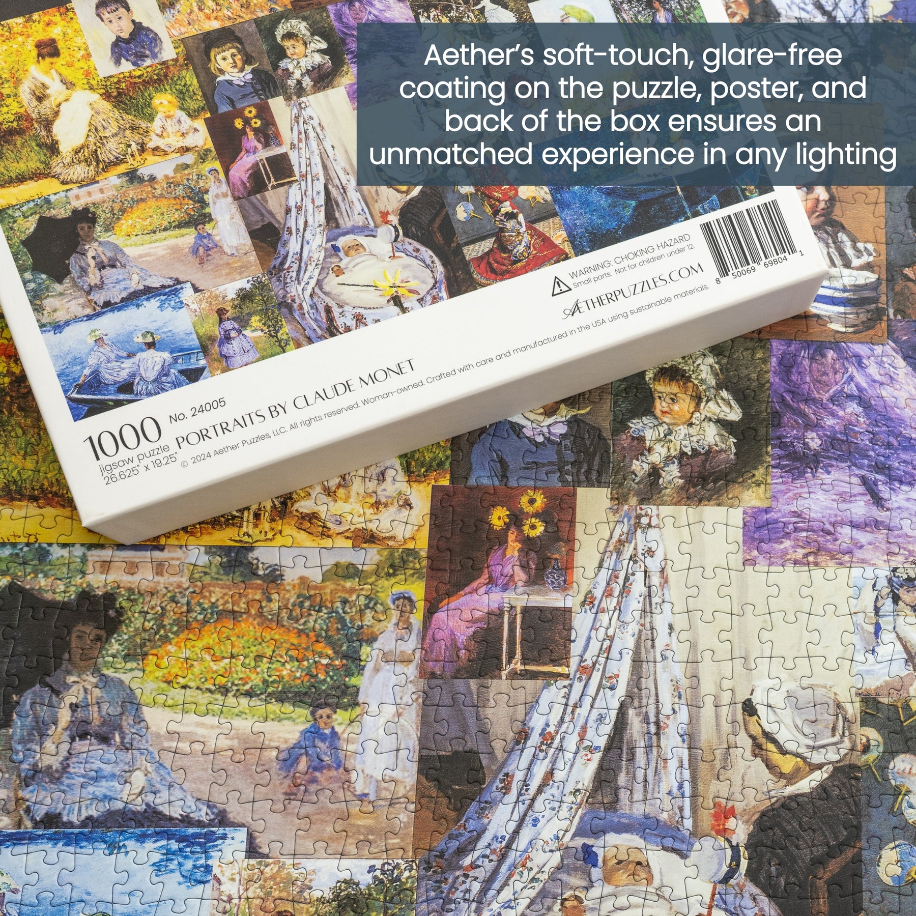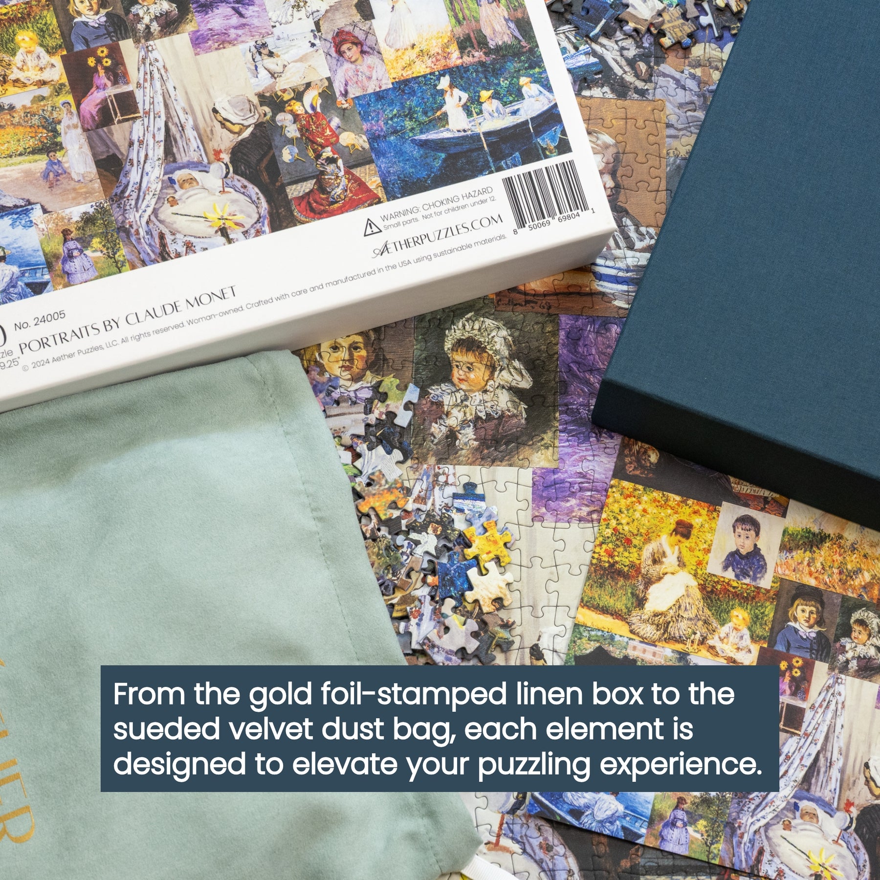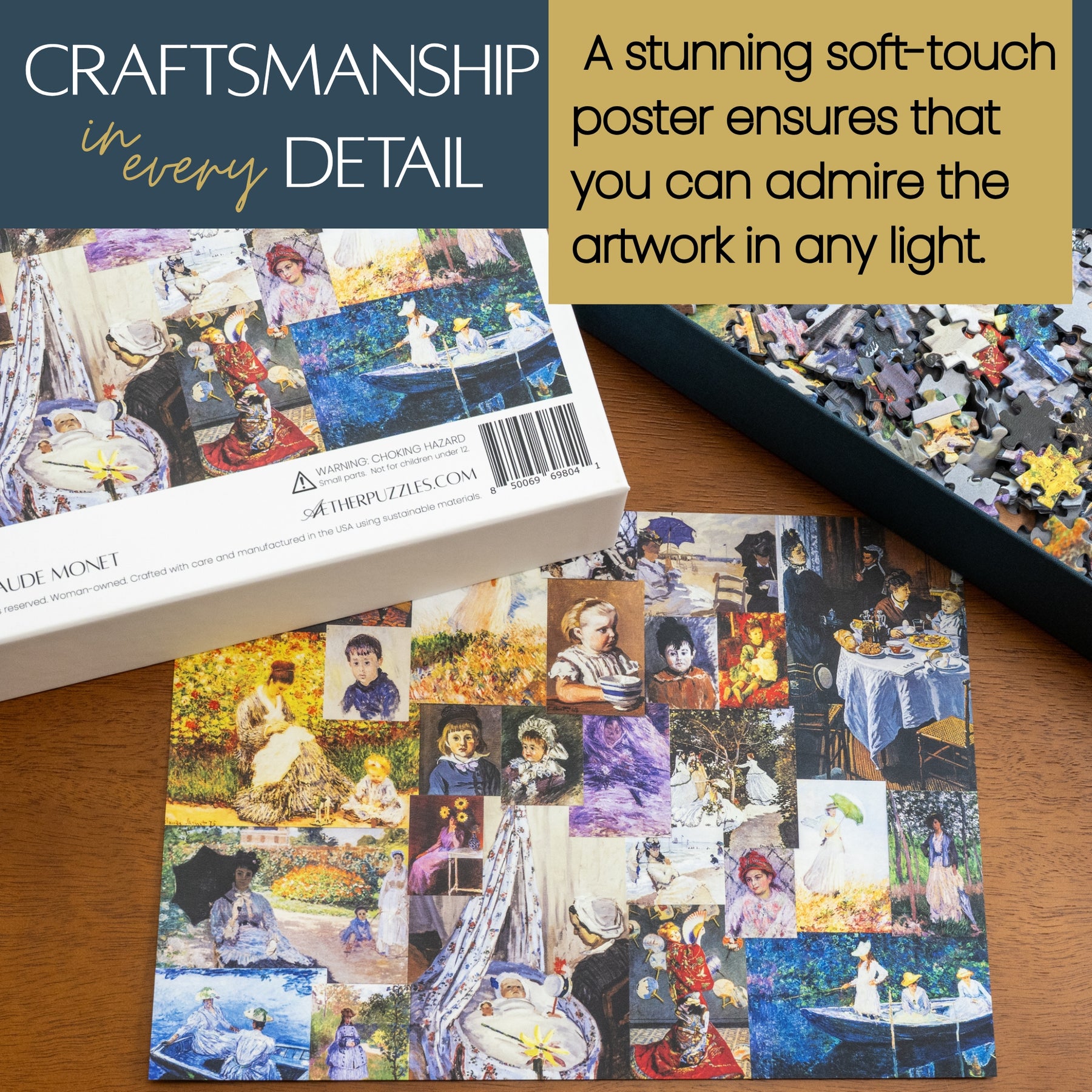 This carefully curated collage features Monet’s diverse depictions of people—women, children, and families—captured in serene domestic settings, vibrant gardens, and leisurely moments by the water. The puzzle showcases his unparalleled ability to portray light, movement, and emotion, inviting you to delve into the tender and dynamic aspects of everyday life during the late 19th century.